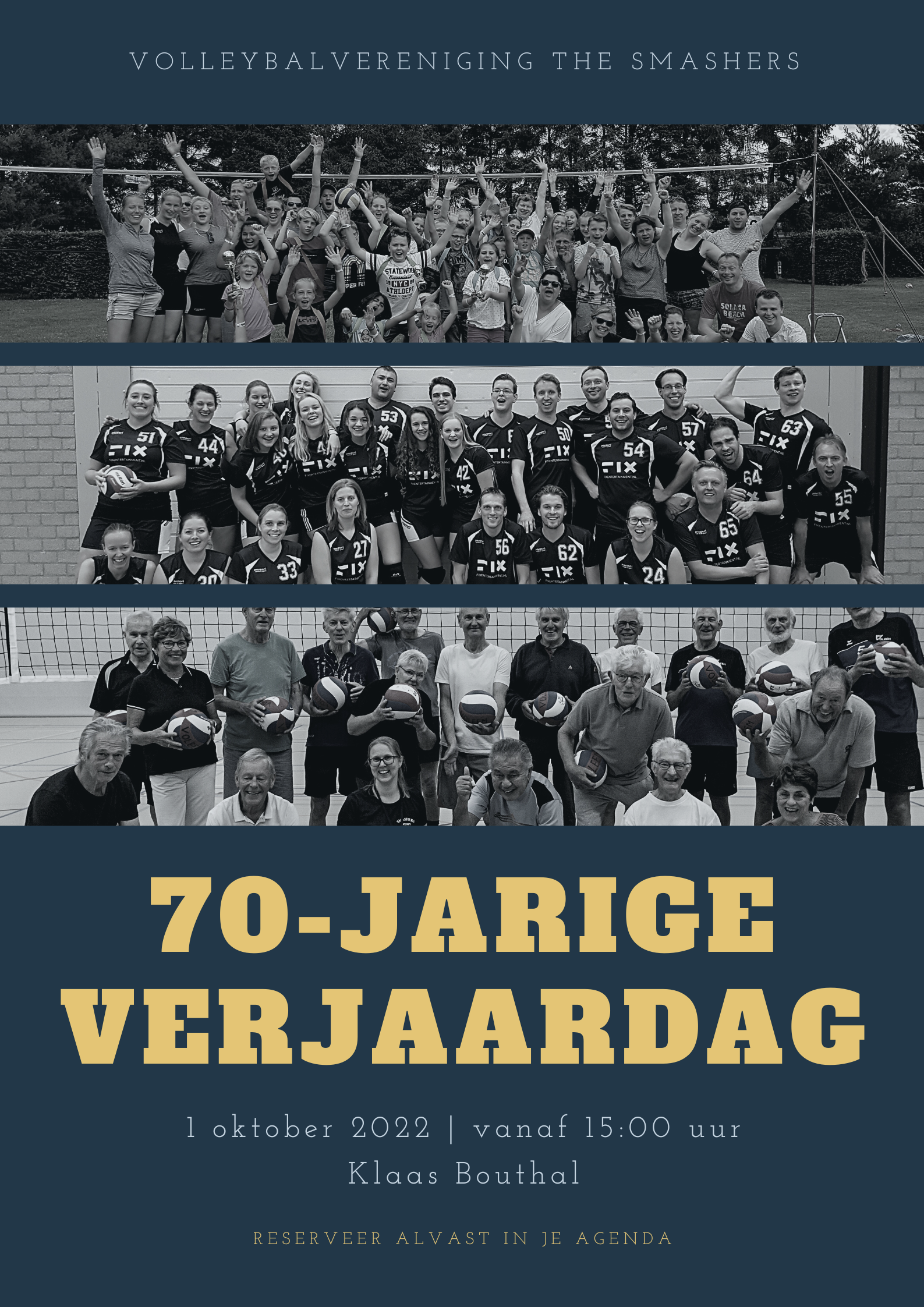 Zaterdag 1 oktober is het feest! Dan vieren de Smashers hun 70-jarige verjaardag. Deze dag zullen er diverse activiteiten zijn voor iedereen. Zet in je agenda! De officiële uitnodiging volgt later.
